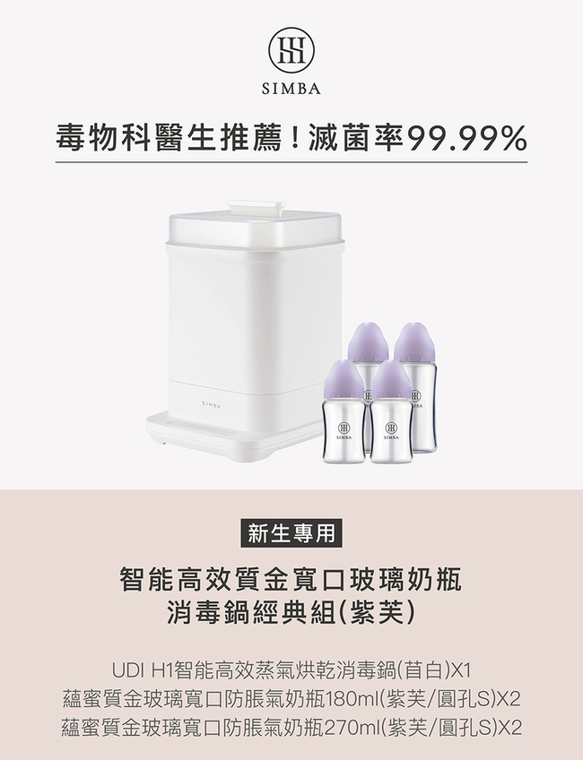 內容物:蒸氣烘乾消毒鍋x1+玻璃奶瓶270mlx2+玻璃奶瓶180mlx2