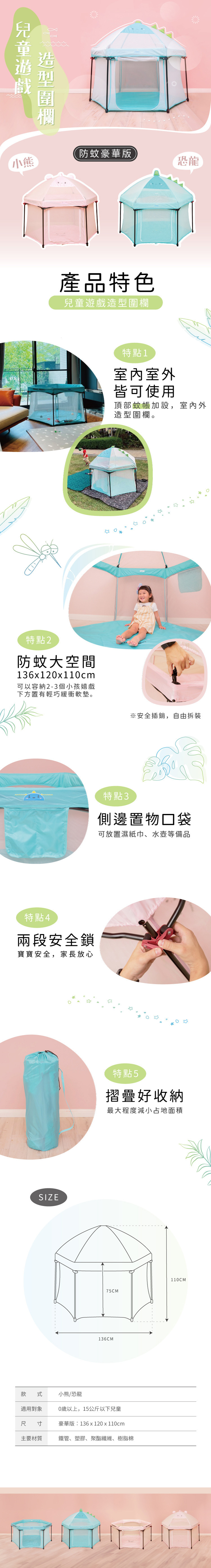 -可愛動物設計圍欄,有頂上蚊帳,摺疊好收納。