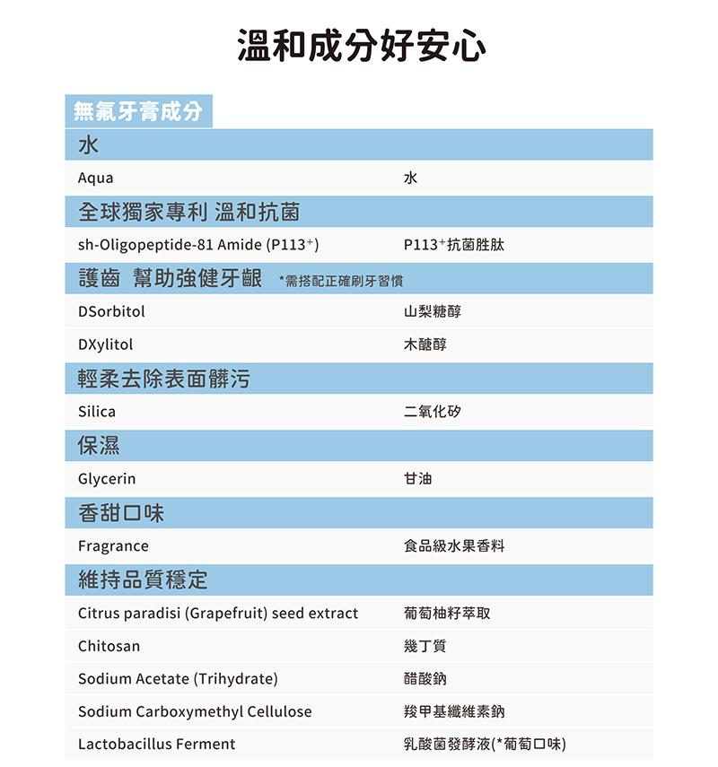成份:水、P113+抗菌胜肽、山梨糖醇、木醣醇、二氧化矽、甘油、食品級水果香料、葡萄柚籽萃取、幾丁質、醋酸鈉、羧甲基纖維素鈉