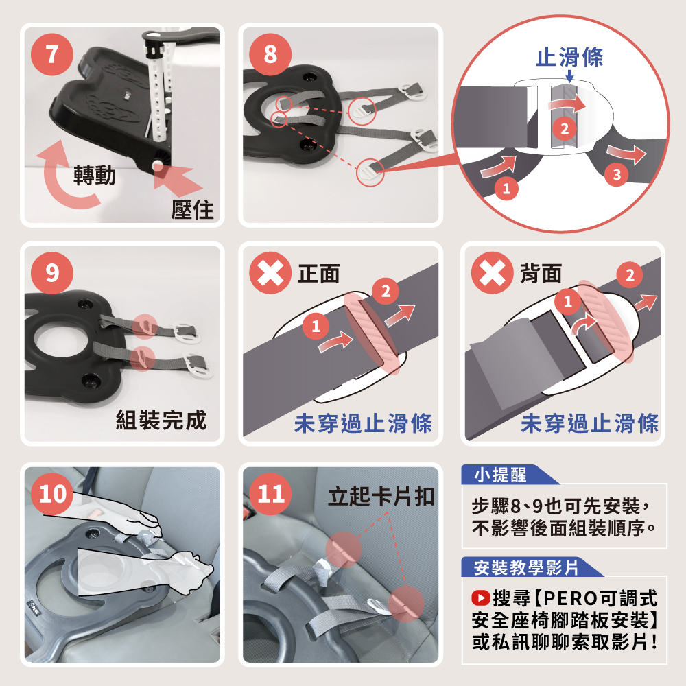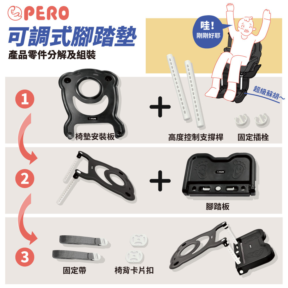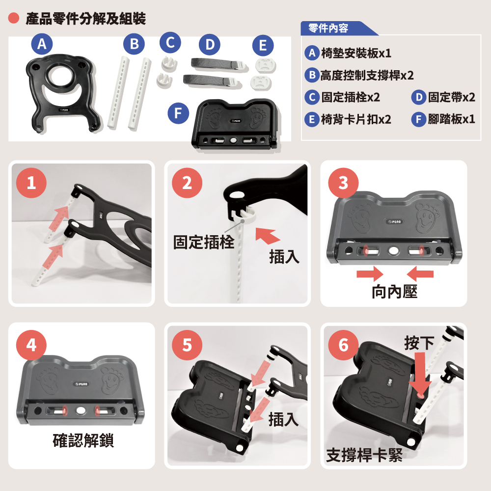 內容物:椅墊安裝板x1、高度控制支撐桿x1、固定插栓x2、固定帶x2、椅背卡片扣x2、腳踏板x1