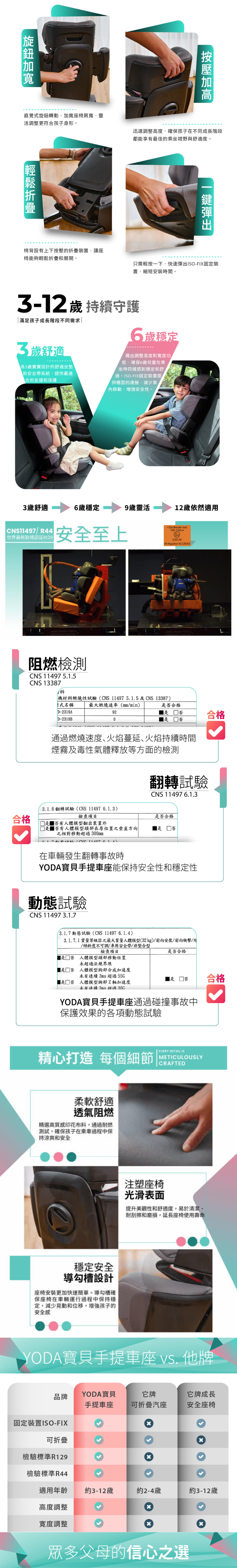 • 多重檢驗全面升級世界最新歐規認証R129,並通過國家檢測標準R44