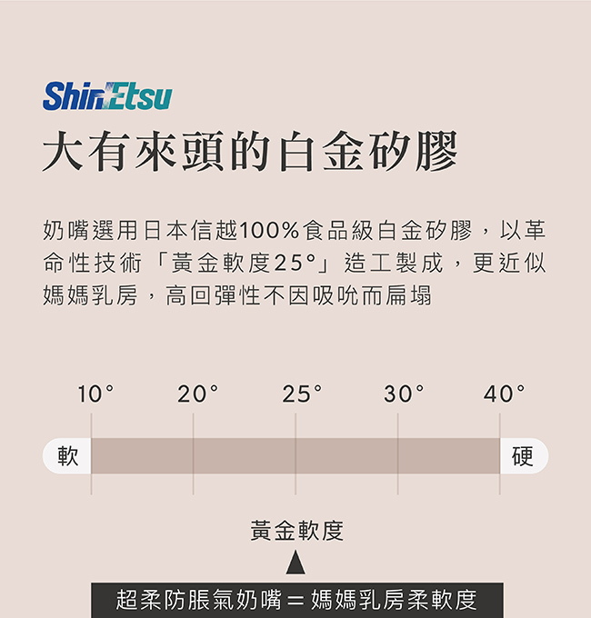 -選用日本信越100%食品級白金矽膠,高回彈性不因吸吮而扁塌。