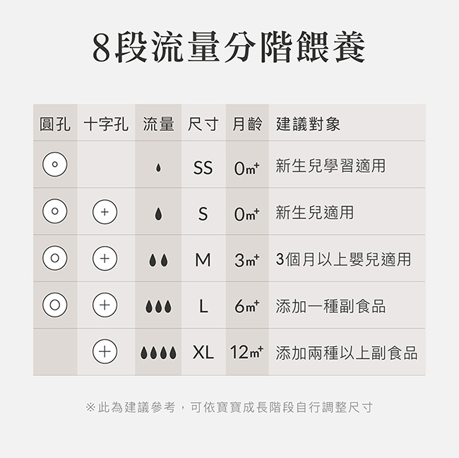 • 防脹氣奶嘴尺寸業界規格最齊全,8段流量分階餵養。