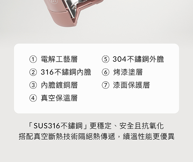 -內膽採用食品級SUS316不鏽鋼,真空斷熱,續溫不間斷。