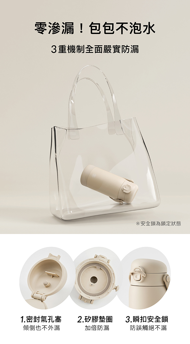 -零滲漏,包包不泡水!3重機制全面嚴實防漏。
