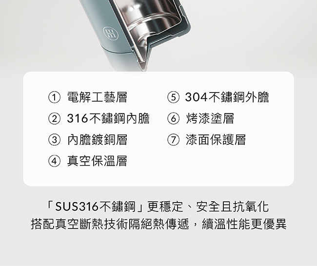 -內膽採用食品級SUS316不鏽鋼,真空斷熱,續溫不間斷。