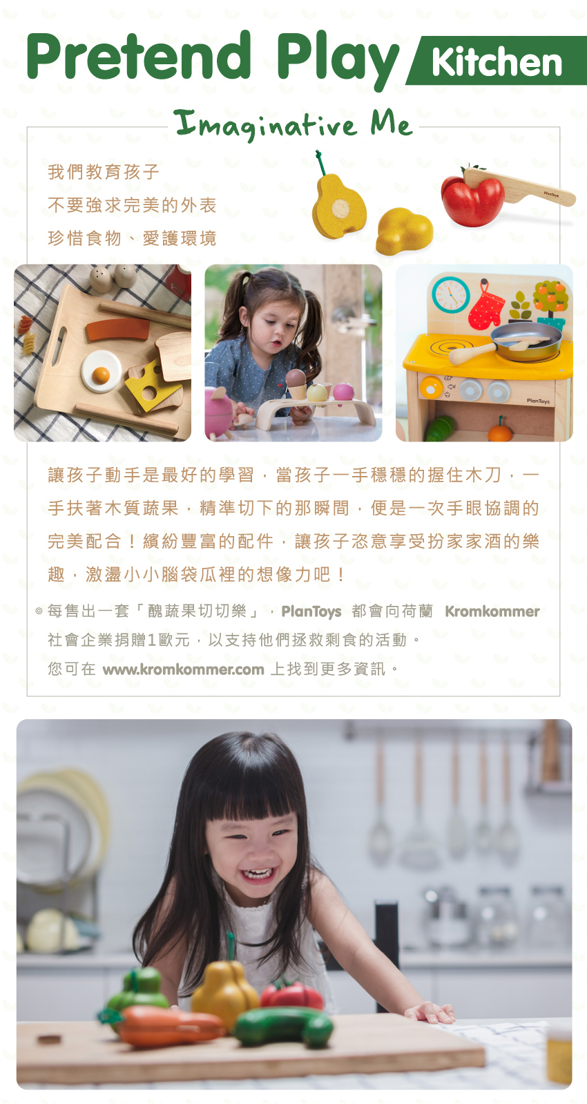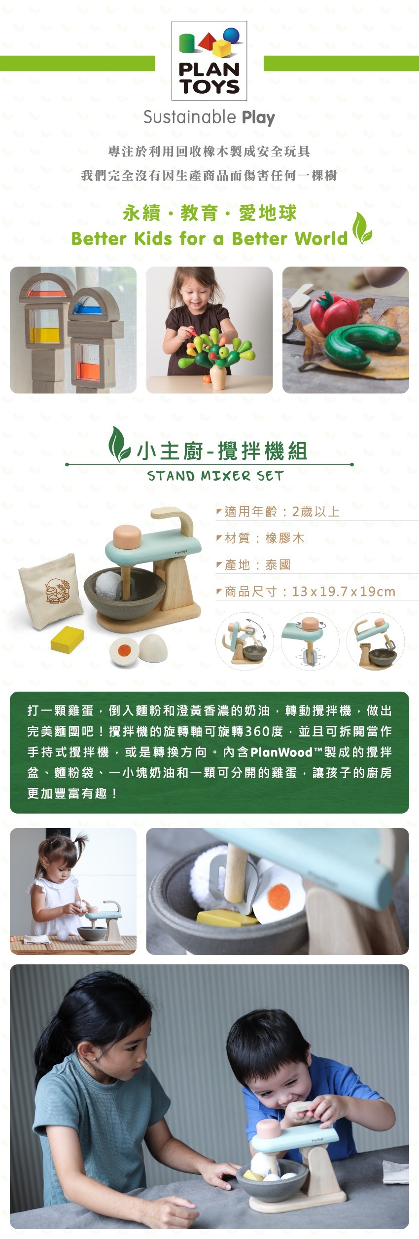 內含planWood™製成的攪拌 盆、麵粉袋、一小塊奶油和一顆可分開的雞蛋,讓孩子的廚房更加豐富有趣!