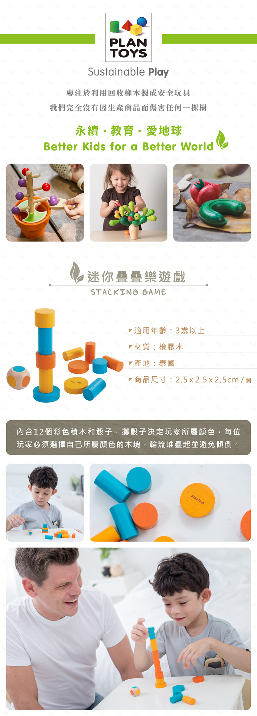 內含12個彩色積木和骰子,擲骰子決定玩家所屬顏色,每位玩家必須選擇自己所屬顏色的木塊,輪流堆疊起並避免傾倒