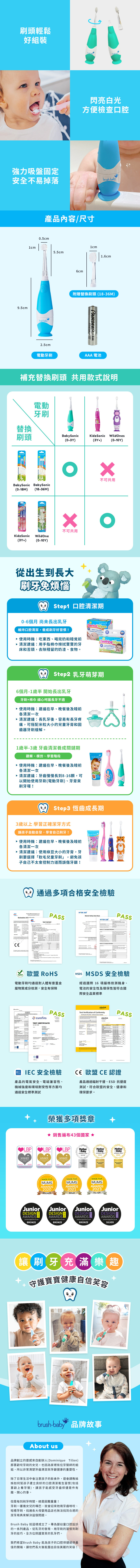 商品內含:牙刷主體,刷頭(0-18個月)/ 替換刷頭x1(18-36個月) /3A 1.5V電池x1