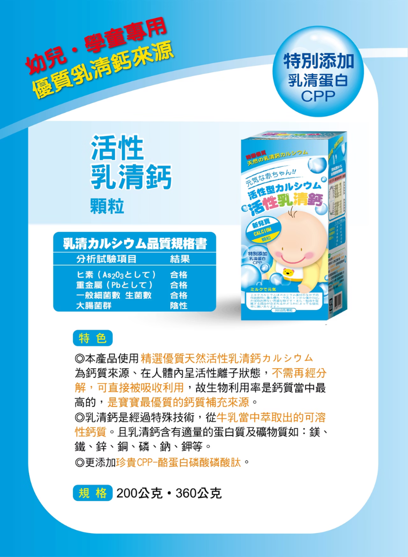 幼兒專用,優質天然乳清鈣來源,特別添加乳清蛋白及酪蛋白磷酸胜肽CPP,並定期分析試驗產品品質規格,成長鈣質營養最安心。