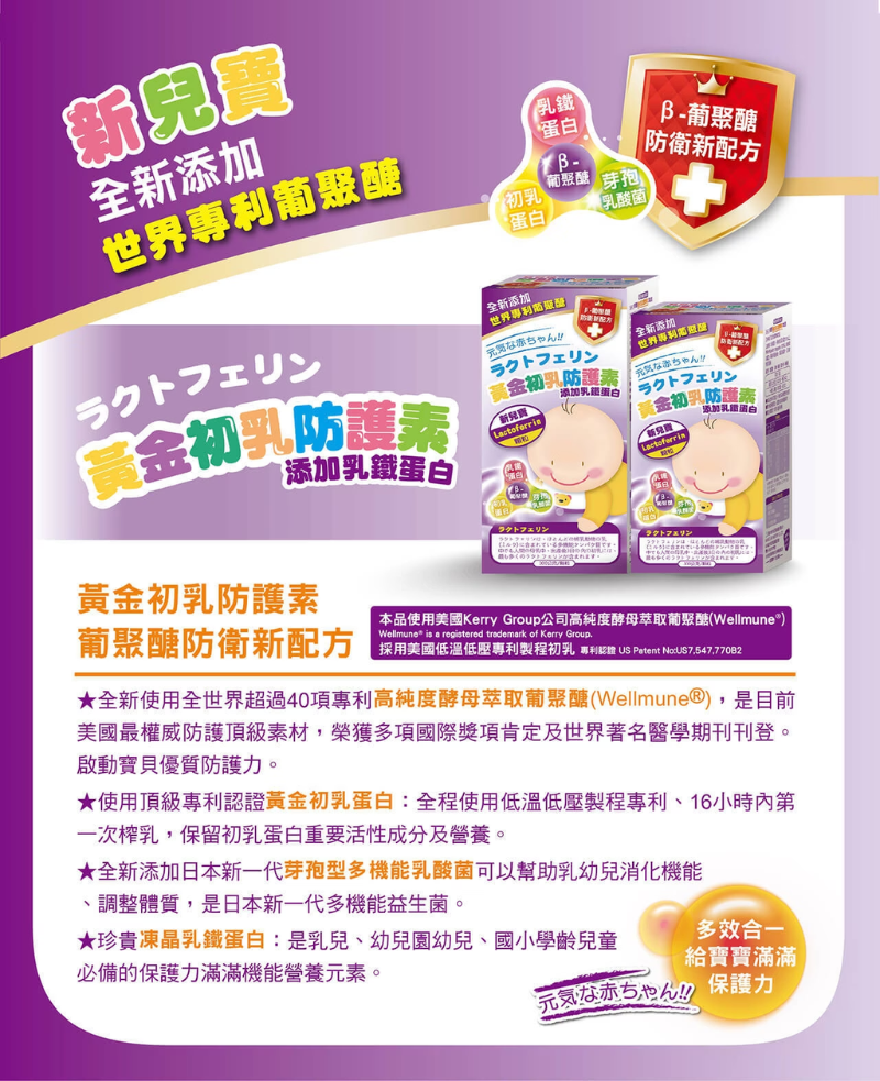 全新添加世界專利葡聚醣防衛新配方,並以乳鐵蛋白、初乳蛋白、芽孢型乳酸菌,多效合一給寶寶滿滿保護力,是乳幼兒、兒童必備防禦滿滿營養元素。