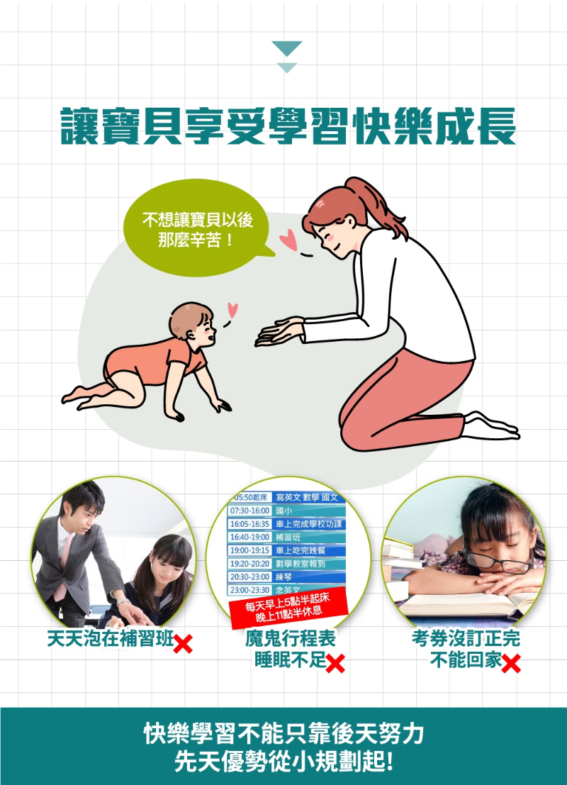 不想讓寶貝以後那麼辛苦,天天泡在補習班、魔鬼行程表睡眠不足、考券沒訂正完不能回家,快樂學習不能只靠後天努力,先天優勢從小規劃起!