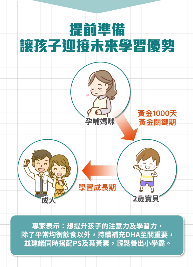 專家表示:想提升孩子的注意力及學習力,除了平常均衡飲食以外,持續補充DHA至關重要,並建議同時搭配磷脂質絲胺酸(又稱腦磷脂、PS)及葉黃素,輕鬆養出小學霸。