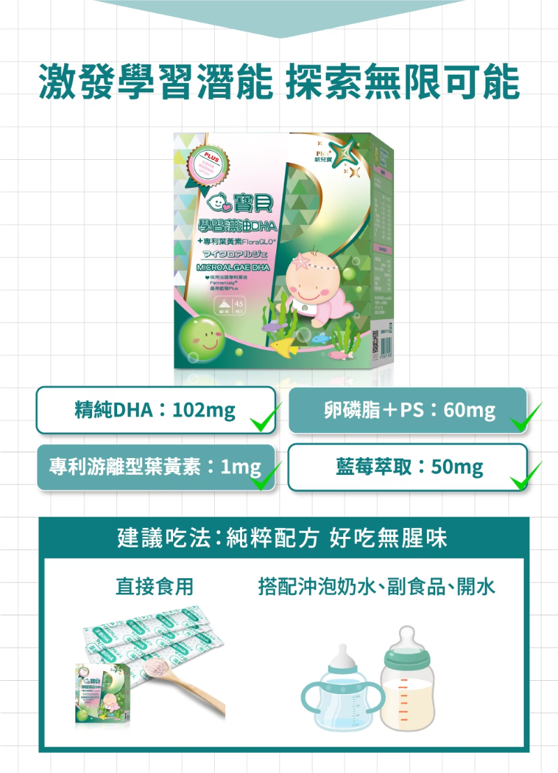 【新兒寶寶貝學習藻油DHA粉】含精純DHA102毫克、卵磷脂+PS 60毫克、專利游離型葉黃素1毫克及藍莓萃取50毫克。純粹配方好吃無腥味,可以直接食用或搭配沖泡奶水、副食品、開水給寶貝食用,激發學習潛能,探索無限可能。