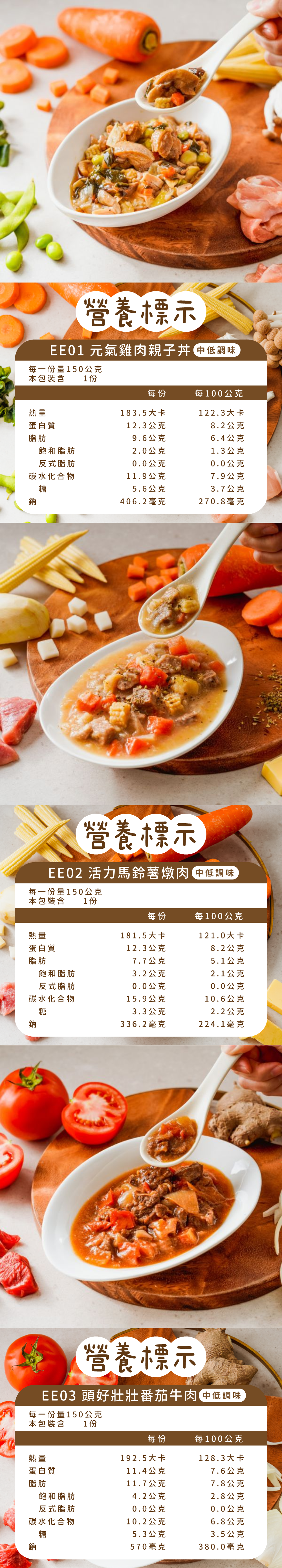 EE02 活力馬鈴薯燉肉|豬骨高湯【水、豬肉(台灣)】、豬肉(台灣)、馬鈴薯、紅蘿蔔、玉米筍、洋蔥、奶油【殺菌乳脂】、麵粉、橄欖油、醬油、味霖【米麴調味液(水、米、米麴、釀造醋、鹽)、蒜、碘鹽、義大利香料【迷迭香、月桂葉、大紅椒、黑胡椒、芫荽、鹽、百里香、糖、綠荳蔻、辣椒、洋芫荽】