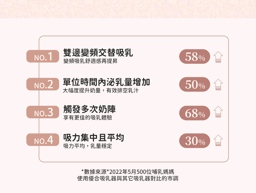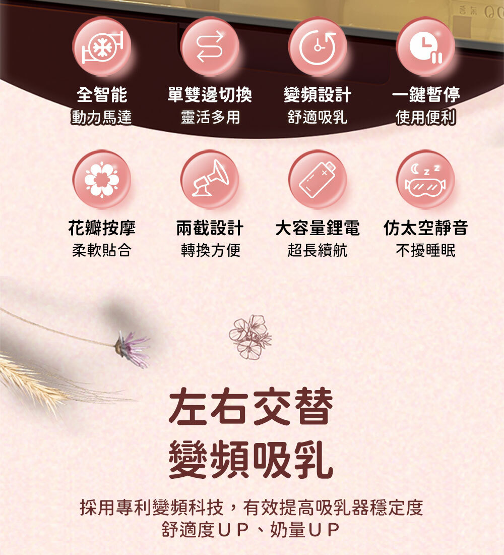• 雙邊變頻交替吸乳,舒適度UP!奶量UP!