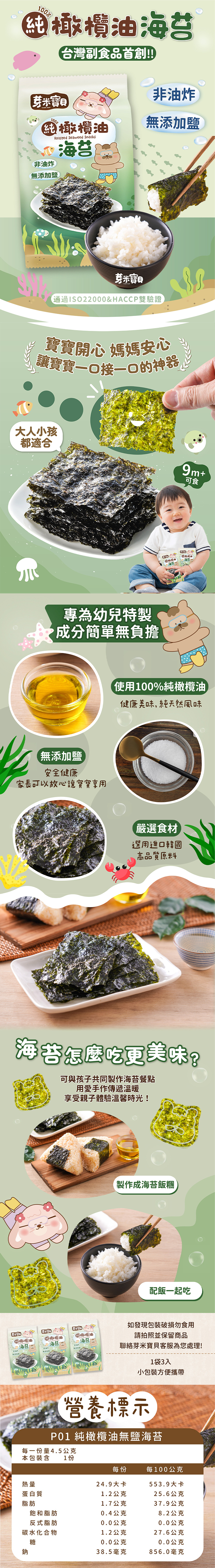 海苔專為幼兒特製,使用100%純橄欖油、無添加鹽