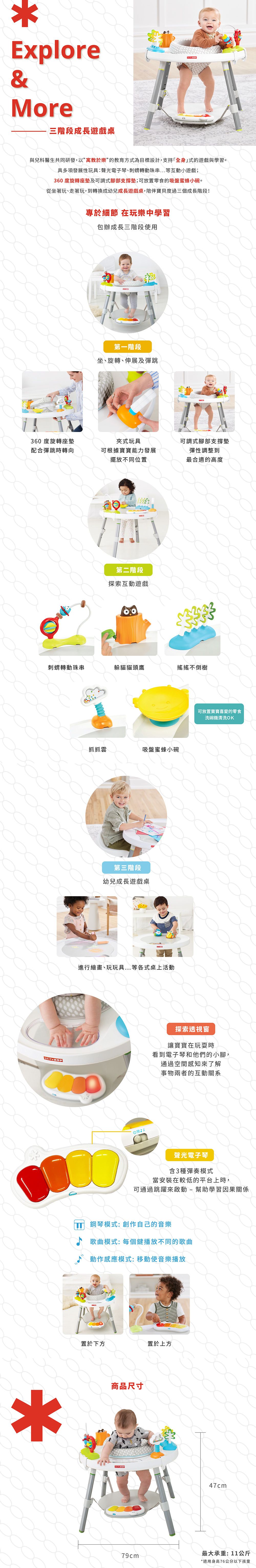 -可調式腳部支撐墊往上移,轉換成無縫表面的幼兒遊戲桌,進行繪畫等桌邊玩樂