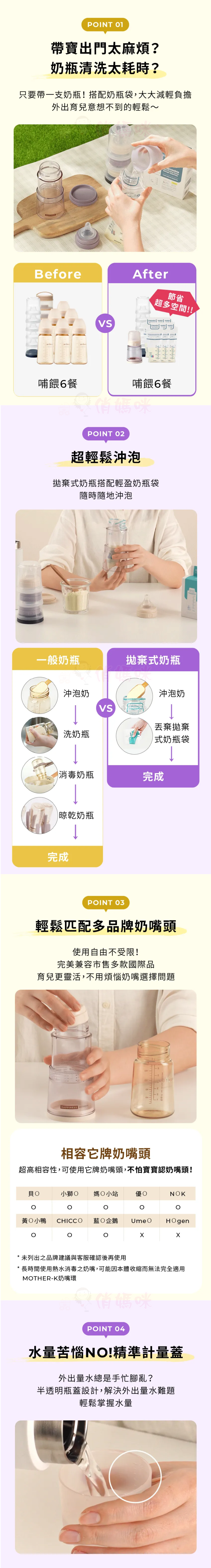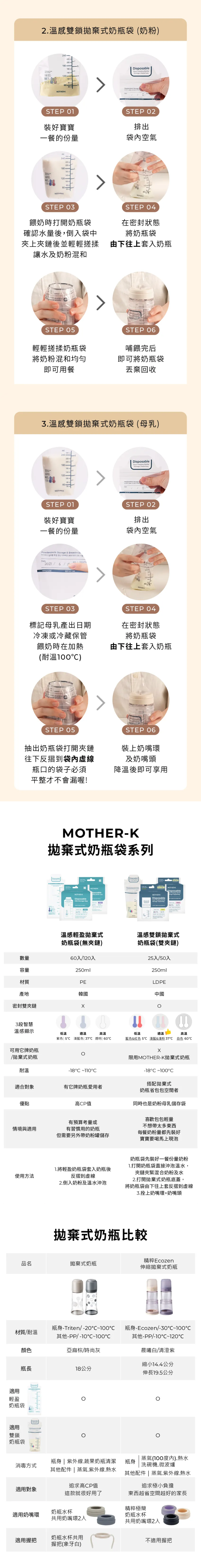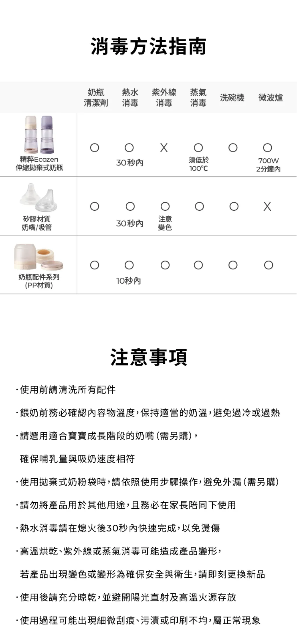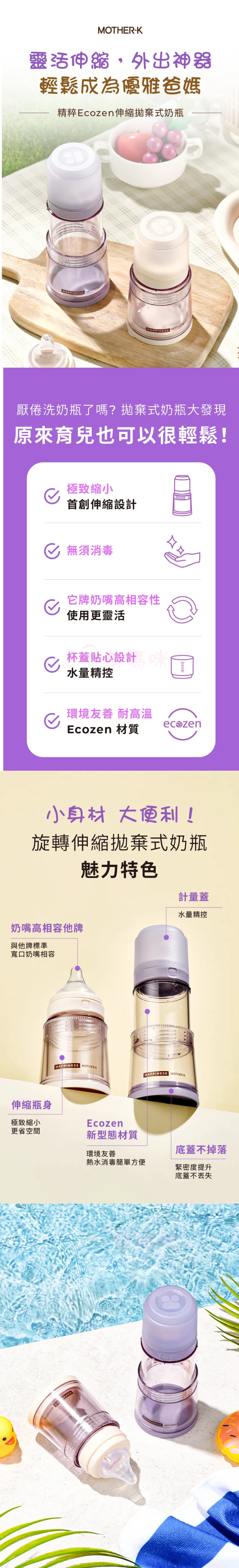 內容物:Ecozen 旋轉伸縮拋棄式奶瓶(無附奶嘴頭)溫感雙鎖拋棄式奶瓶袋 25入(雙夾鏈)