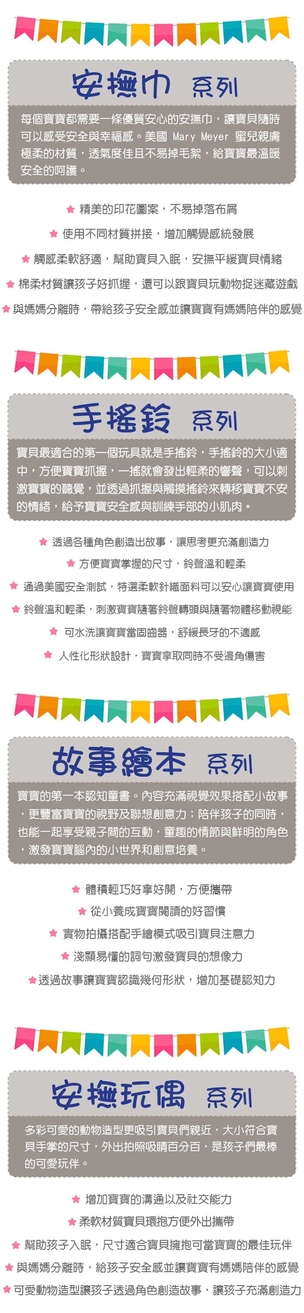安撫玩偶、柔軟安撫巾、柔軟手搖鈴/100%聚脂纖維、故事繪本/厚紙質