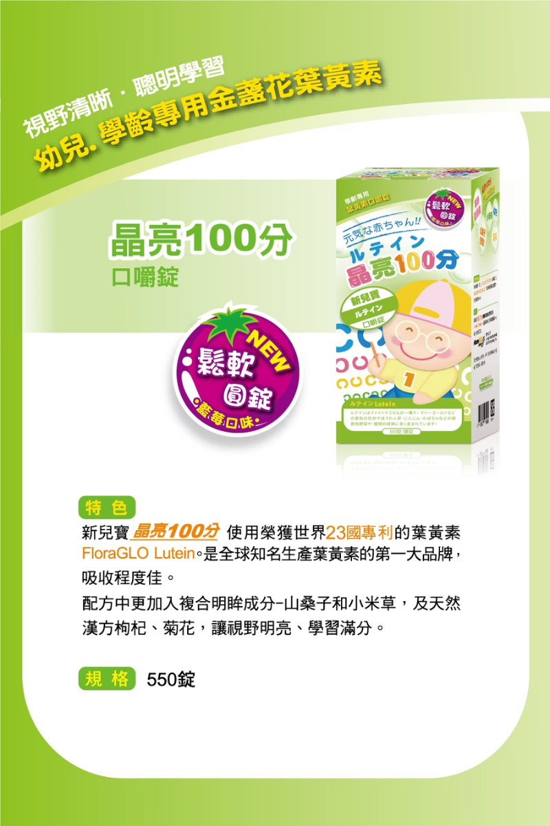 新兒寶▸晶亮100分使用榮獲世界23國專利的葉黃素FloraGLO Lutein。是全球知名生產葉黃素的第一大品牌,為游離型葉黃素吸收程度佳。配方中更加入複合明矇成分-山桑子和小米草及天然漢方枸杞、菊花,讓視野更明亮、學習滿分。