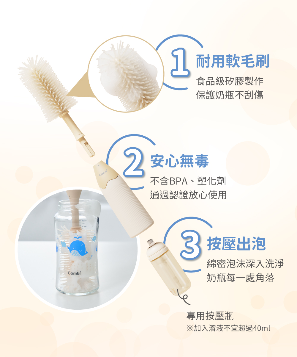 - 按壓出泡奶瓶刷,讓清潔更有效率