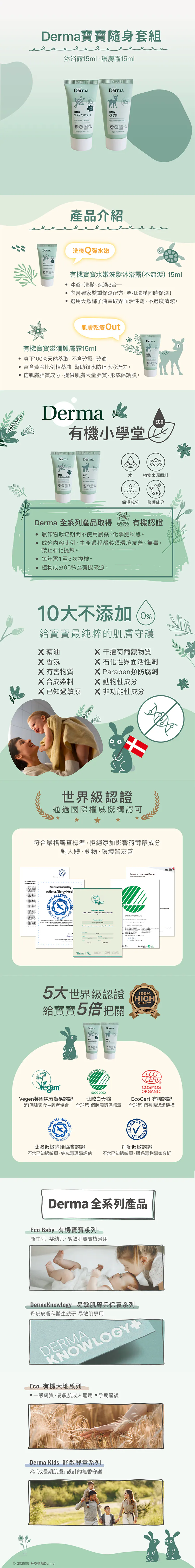 內容物含:Derma 丹麥寶寶有機水嫩洗髮沐浴露15mlx1+Derma 丹麥寶寶有機滋潤護膚霜15mlx1