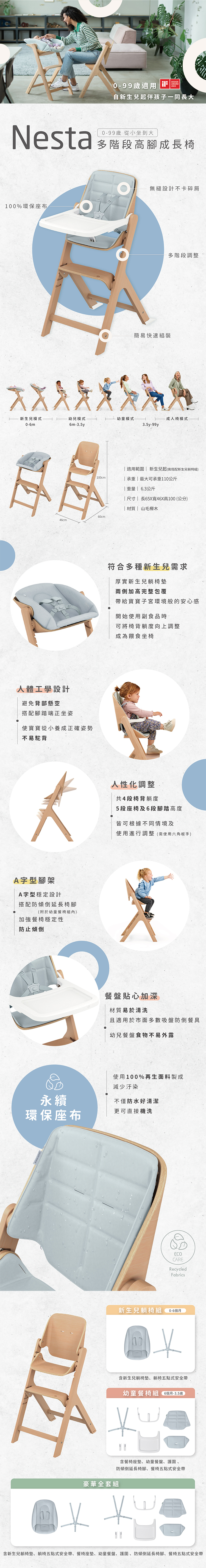 內容物:餐椅本體 + 餐盤組配件(餐椅坐墊、幼童餐盤、護圍、防傾倒延長椅腳、餐椅五點式安全帶)