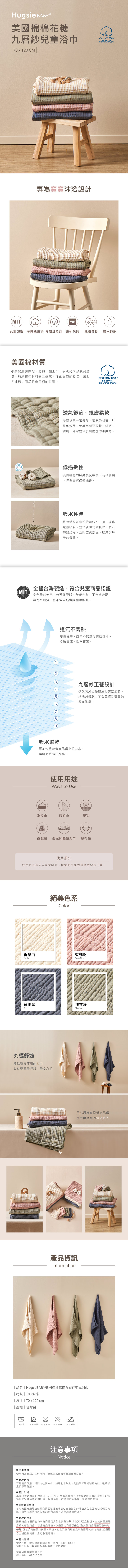 - 使用用途:洗澡巾、餵奶巾、蓋毯、遊戲毯、嬰兒床墊墊背巾、尿布墊