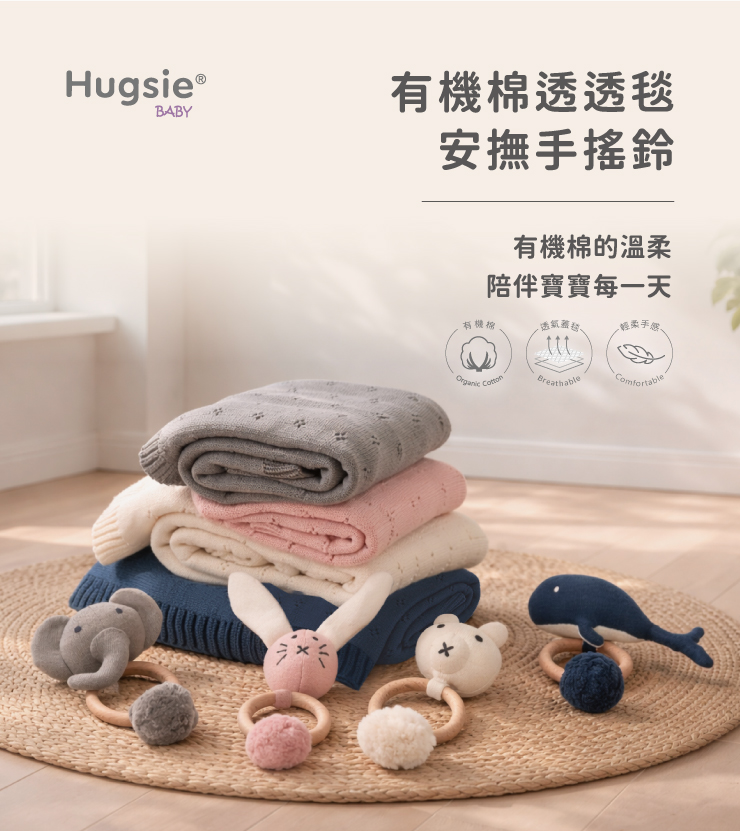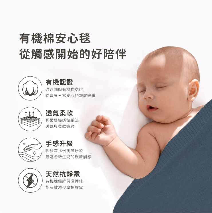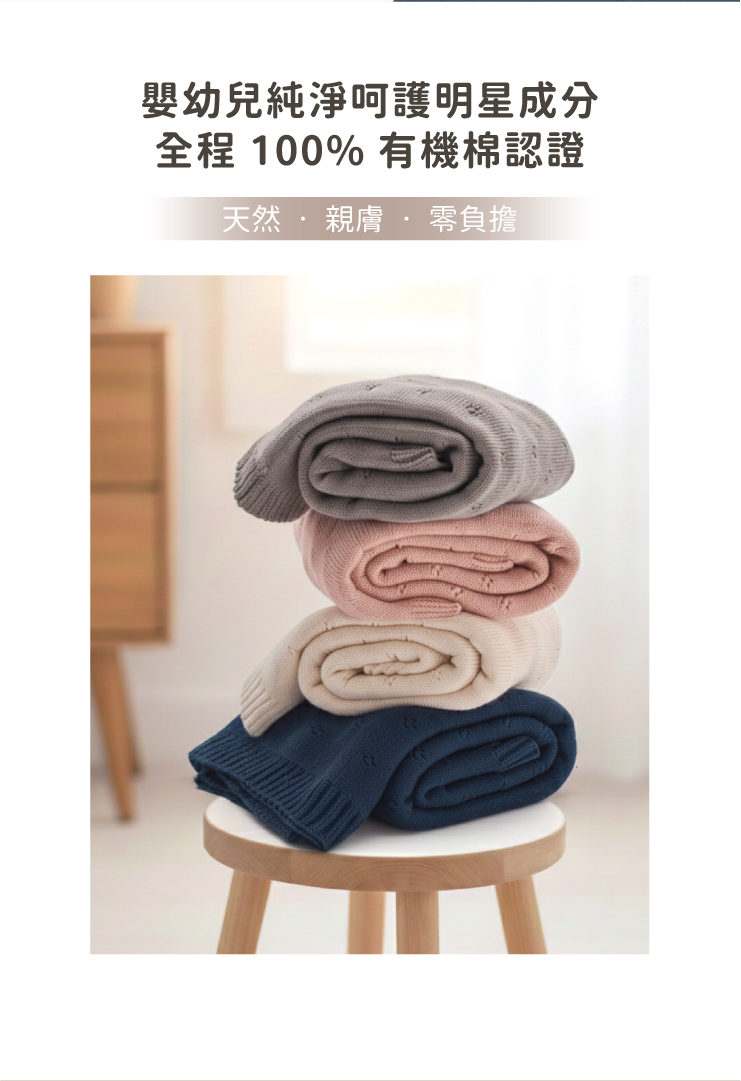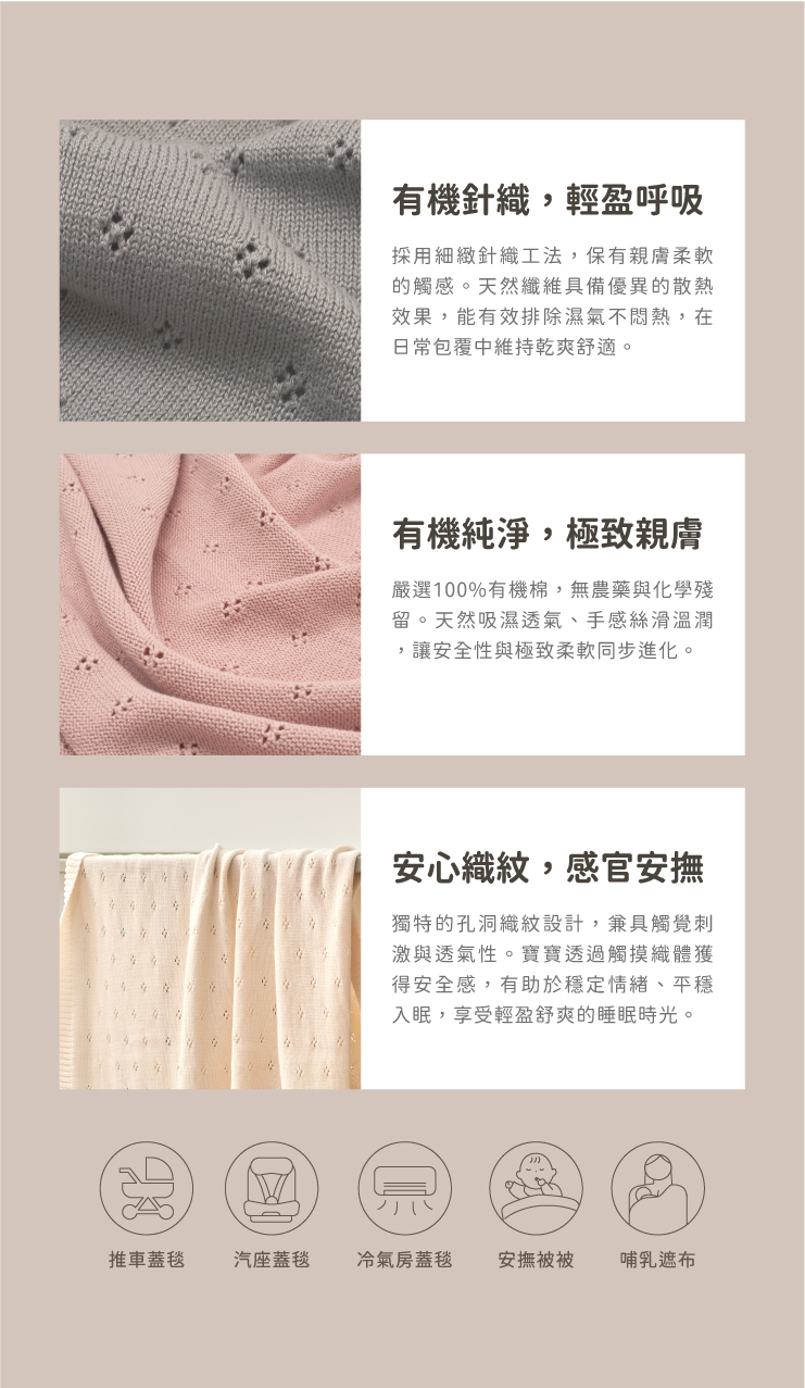.100% 有機棉針織毯,觸感親膚柔軟、透氣不悶熱