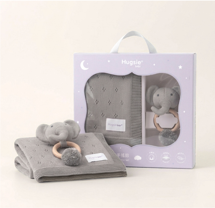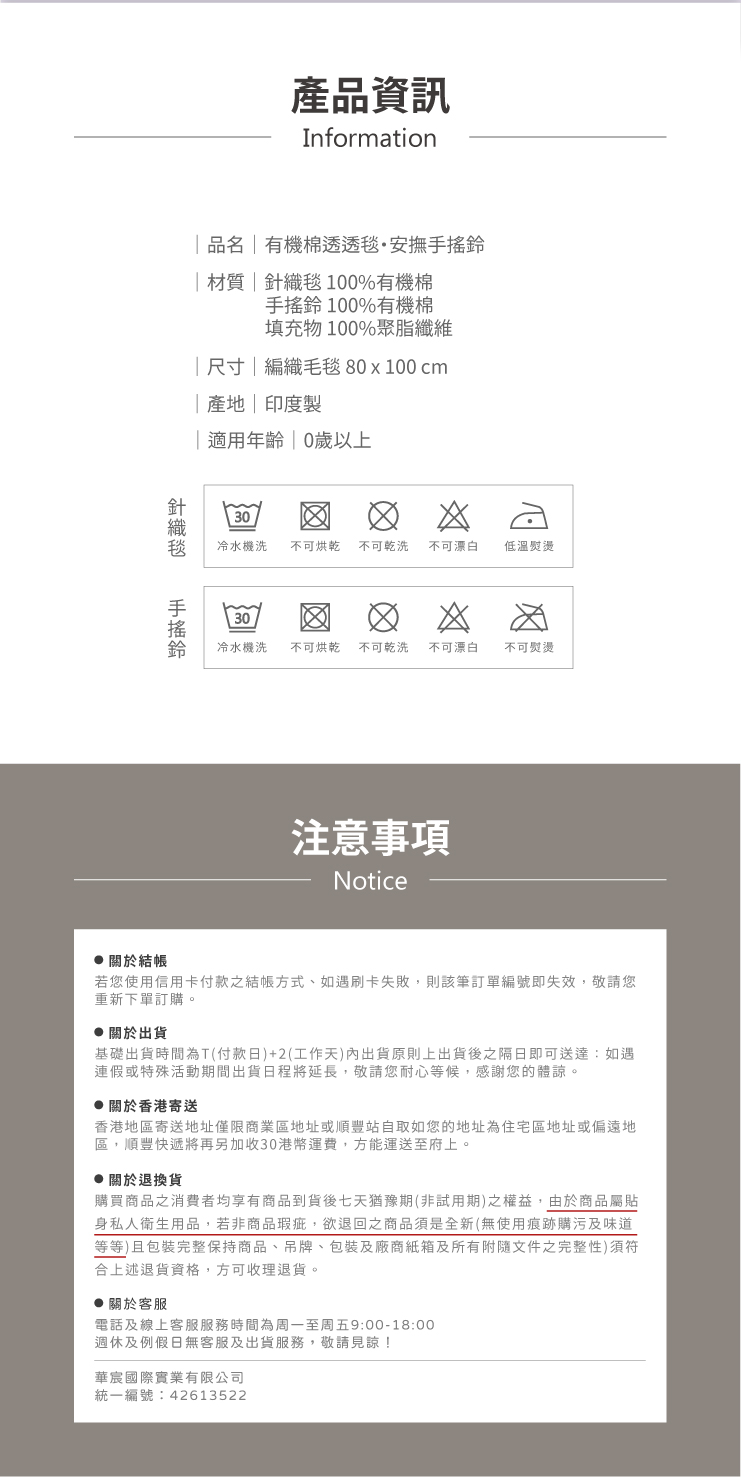 .禮盒內容物:有機棉針織毯 x1、安撫手搖鈴乙 x1