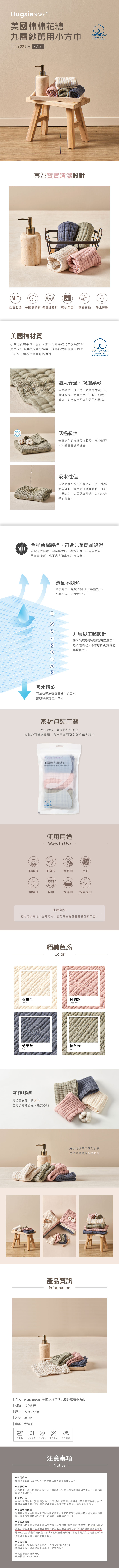 - 使用用途:口水巾、拍嗝巾、擦臉巾、手帕、餵奶巾、枕巾、洗澡巾、洗屁屁巾