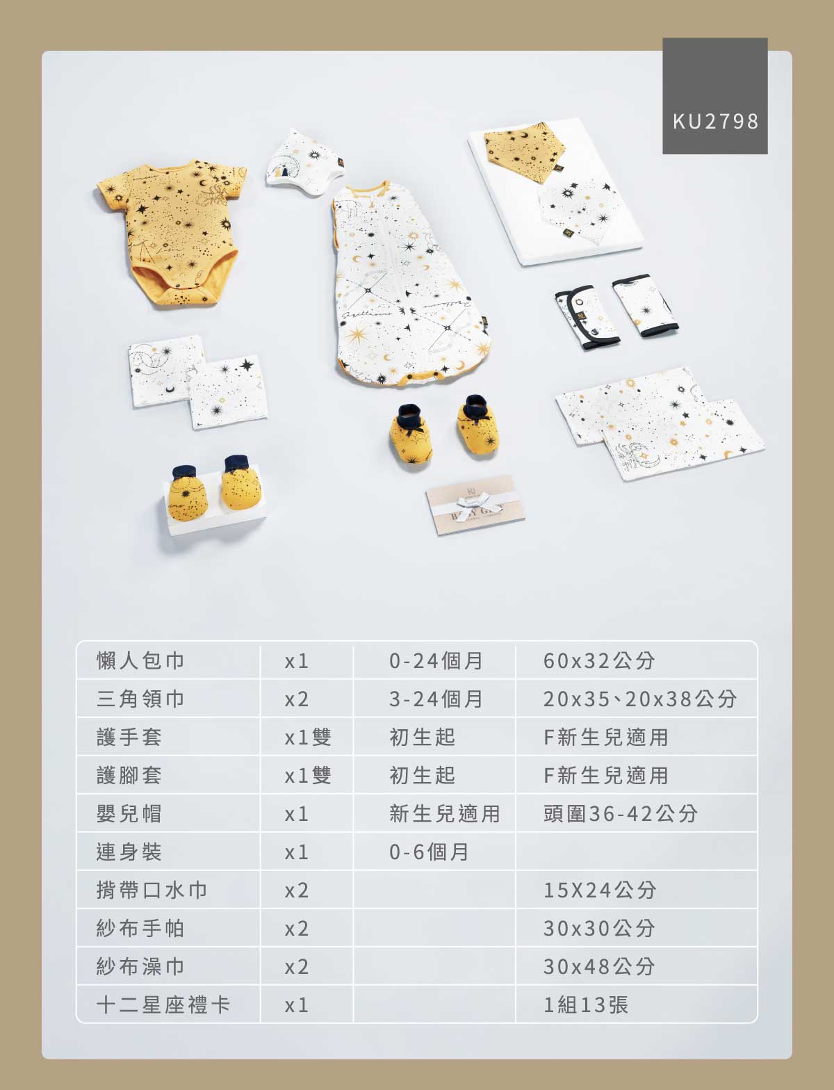 內容物:成長懶人包巾x1、三角領巾x2、護手套x2、護腳套x2、嬰兒帽x1、連身裝x1、揹帶口水巾x2、紗布手帕x2、紗布澡巾x2、十二星座禮卡x1