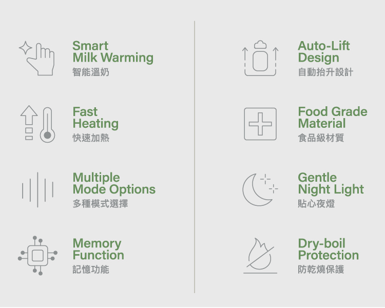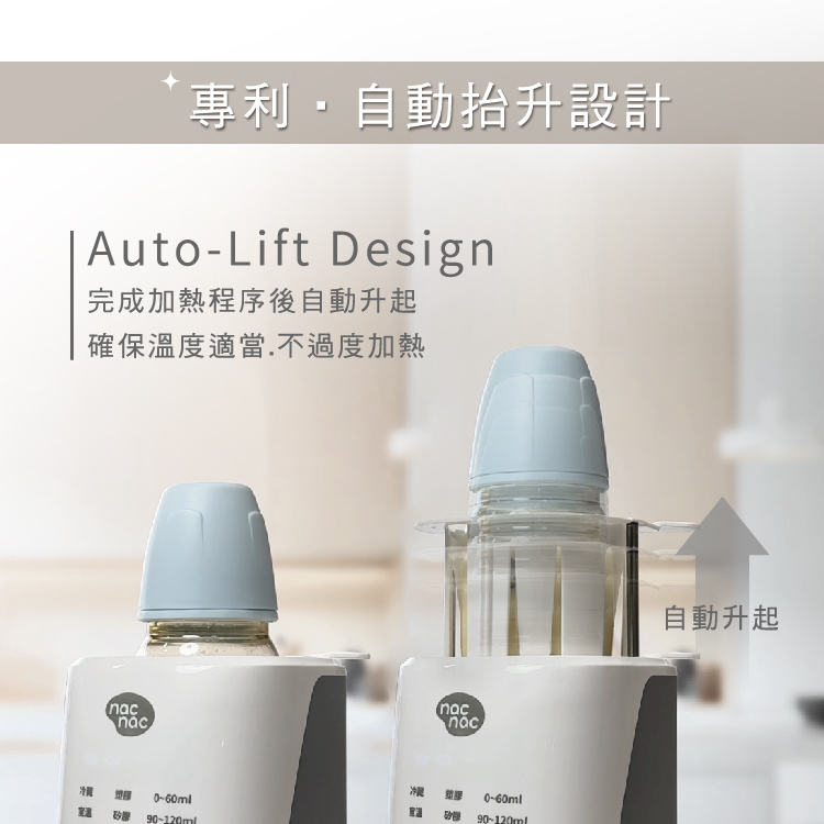 - 首創專利設計溫奶完成即自動升起,不過度加熱營養不流失