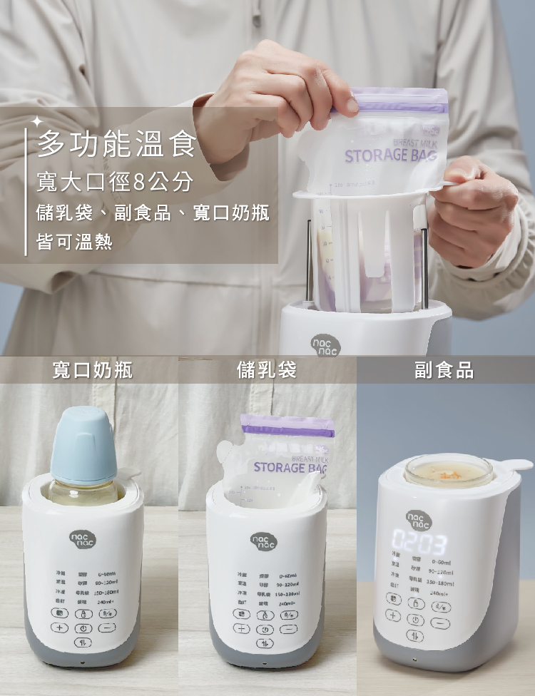 - 寬大口徑8公分,寬口奶瓶、儲乳袋、副食品皆可溫熱