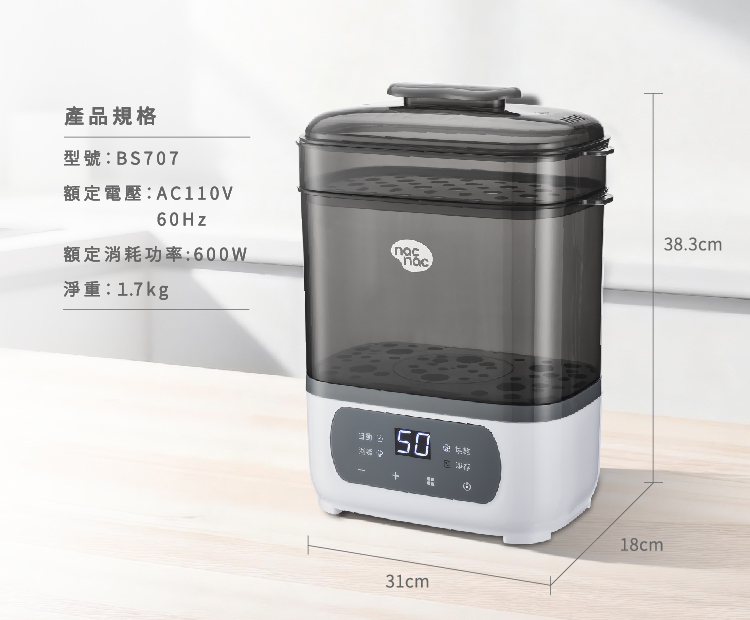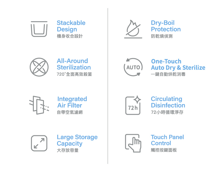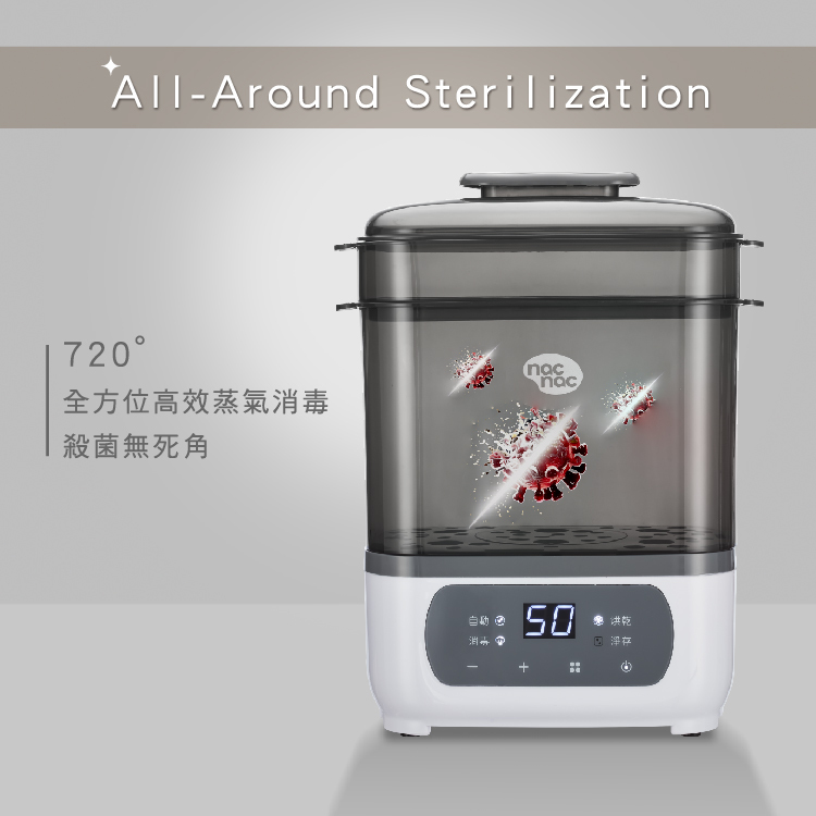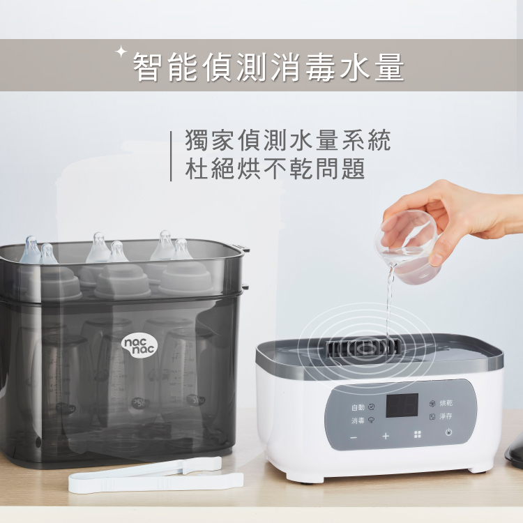 - 智能偵測消毒水量,防乾燒或未蒸乾問題