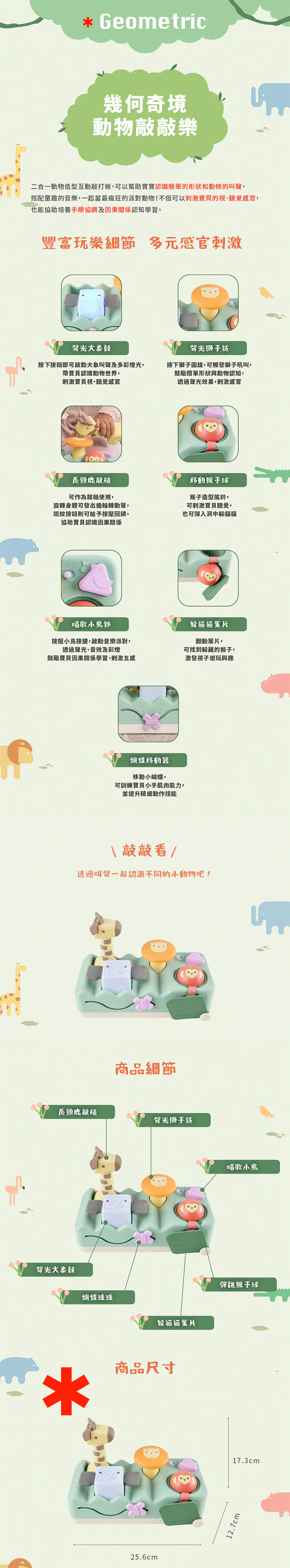 -內建 16 種動物音效、歌曲、鼓聲與鈸片音效幫助寶寶認識基本形狀