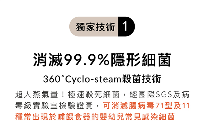 • 360˚Cyclo-steam殺菌技術,消滅99.9%隱形細菌。