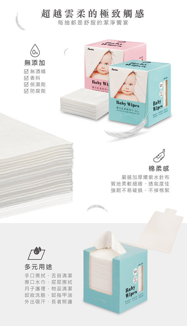 • 嚴選加厚嫘縈水針布,質地柔軟細緻,透氣度佳,強韌不易破損,不掉棉絮。